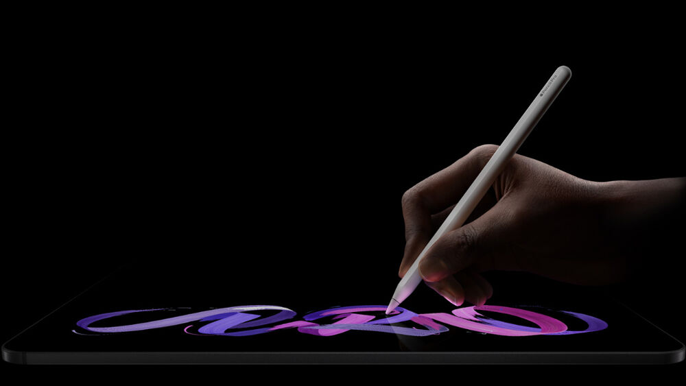 Squeezing the Apple Pencil Pro allows up to bring up a new palette, allowing you to quickly switch tools, line weights, and colors. A built-in gyroscope lets you control the shape of the pen and brush tools by rotating the barrel. Double tapping the pencil quickly switches between tools such as the pen and eraser. The haptic engine provides feedback as you squeeze or double tap using the pencil. Hovering the Apple Pencil Pro over the screen provides a preview before you make a mark. Apple Pencil Pro magnetically attaches and charges along the side of iPad Pro, and you can locate your lost pencil with the Find My app.