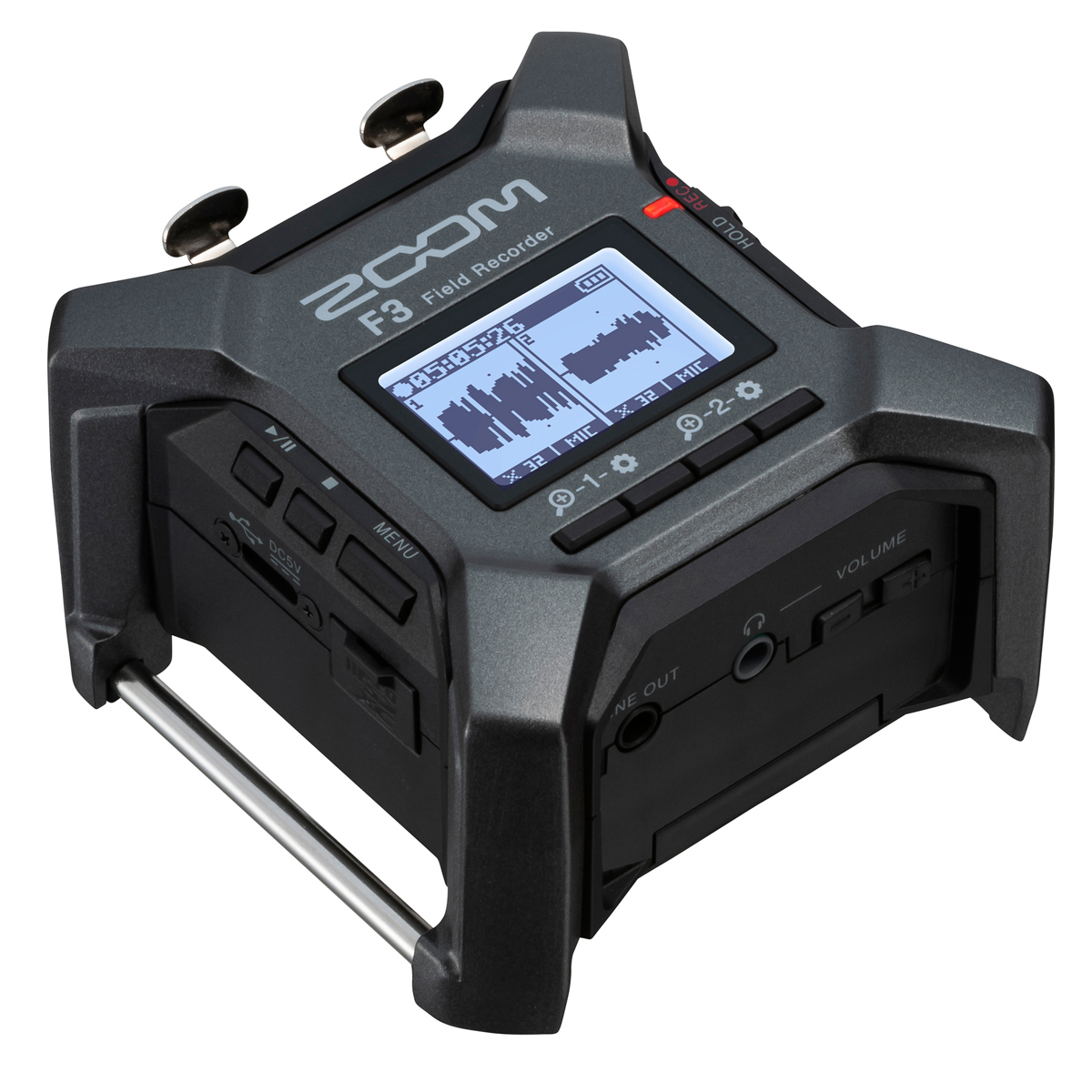 This recorder features a sturdy metal housing with protective bars and locking connectors. It is built to handle demanding outdoor conditions and daily professional use. The small square form factor fits easily on a rig, tripod, or desk. Its bright display shows real-time waveforms for quick visual checks. As a result, the zoom f3 recorder combines durability with convenience for field recording work.